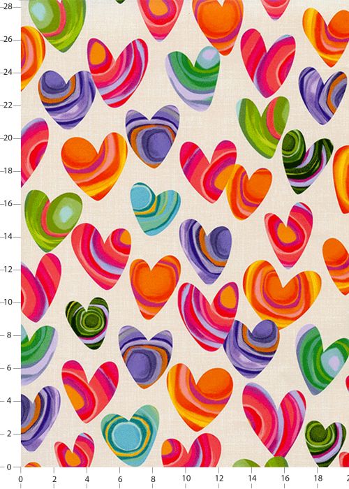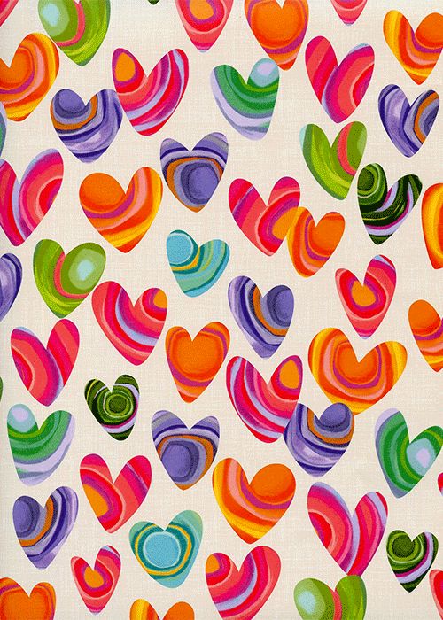 Papier imprimé planche de coeurs aux couleurs vives et gaies de différentes tailles sur un fond légèrement tramé lin.Symboles d'amour et de joie, ces coeurs accompagnent autant des moments festifs (anniverdsaire, mariage, fêtes diverses...) que personnels.
