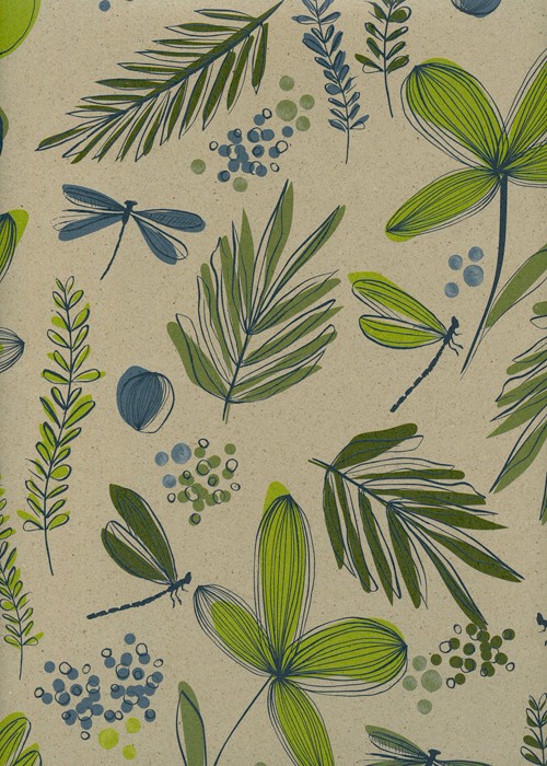 Papier imprimé fleurs et feuillage sur un fond beige.