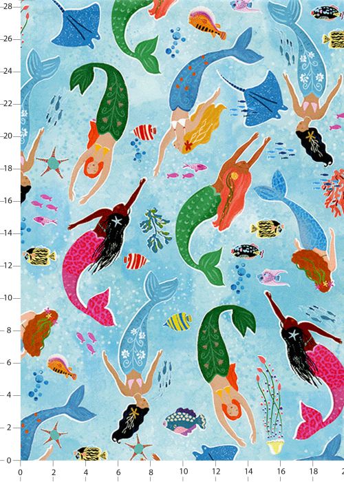 Papier imprimé les sirènes colorées qui nageant dans l'eau avec des poissons, des étoiles et de la végétation de plusieurs couleurs : rouges, jaunes, roses....