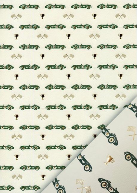 Papier italiens fantaisie sur un support haut de gamme au motif de bolides verts et or. L'impression de ce papier est réalisée par presse typographique (pression exercée sur le papier). Ce procédé permet d’apporter aux motifs un léger relief. La finition est apportée avec un rehaut doré.