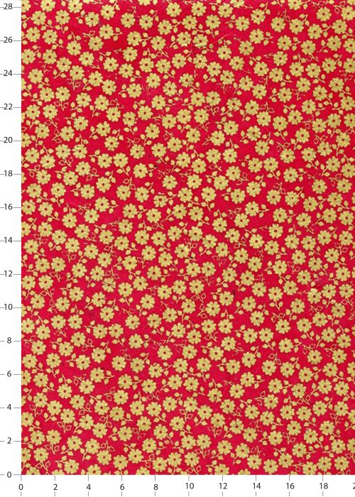 Papier népalais imprimé petites fleurs or sur fond rouge de fabrication 100% artisanale parfait pour sublimer vos réalisations. Le papiers Lokta est un papier fait à la main. Ce type de fabrication artisanale peut laisser apparaitre des imperfections (irrégularités, petites tâches, fibre végétale…) ou des irrégularités de teintes d'une feuille à l'autre.