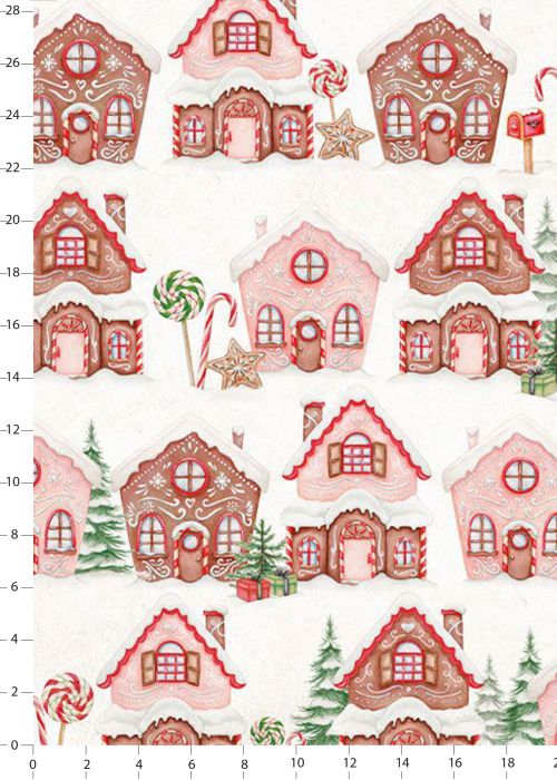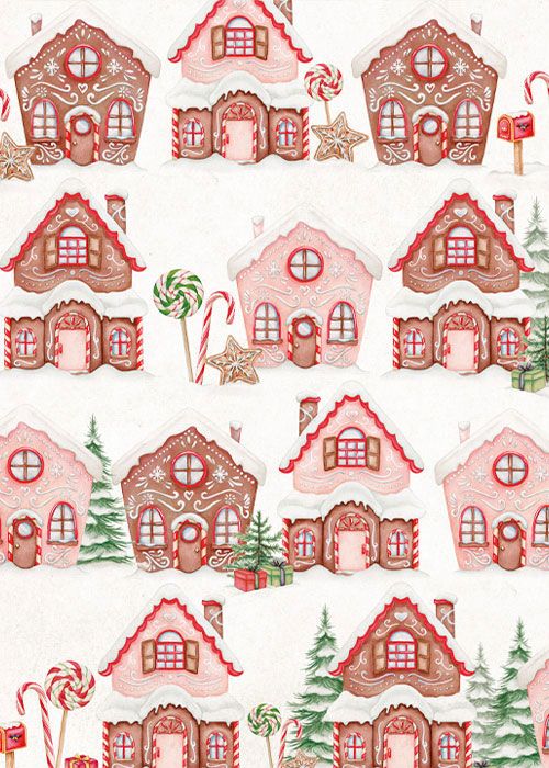 Papier imprimé avec motifs de Noël : maison en pain d'épices, sucettes et sucres d'orge , cadeaux et sapins.