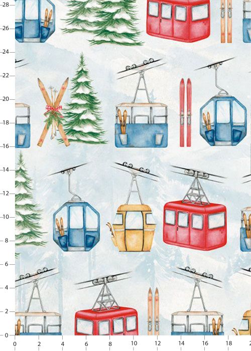 Papier imprimé avec motifs d'hiver et de Noël : télécabines colorées et sapins enneigés. Skis avec batons et rubans colorés de Noël