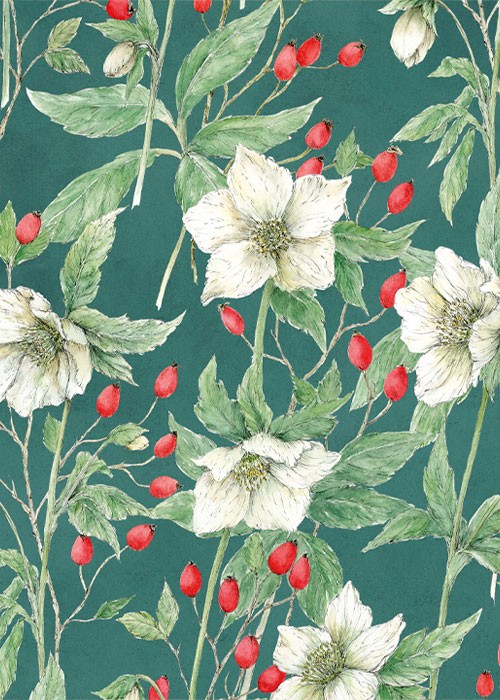Papier imprimé avec motif floral : Héllébore (ou vératre) blanche et grappes rouges. Floral hivernal.