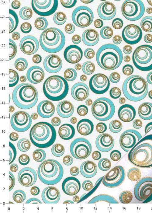 Papier indien imprimé "spirale" turquoise et or sur un fond blanc.