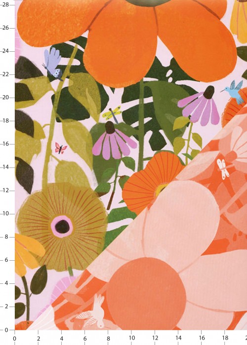 Papier imprimé recto verso, un coté représentant des fleurs ambiance pop et une autre floral ton sur ton corail.