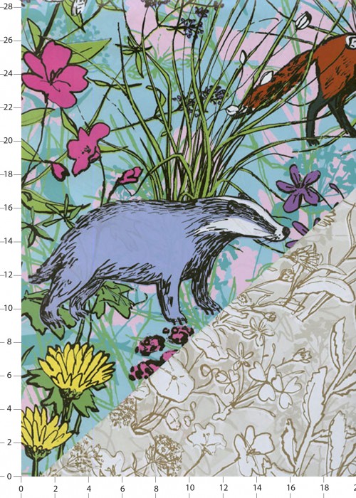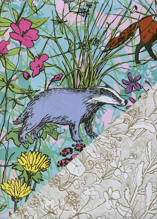 Papier imprimé recto verso, un coté représentant des animaux et oiseaux dans la foret et un autre un feuillage or