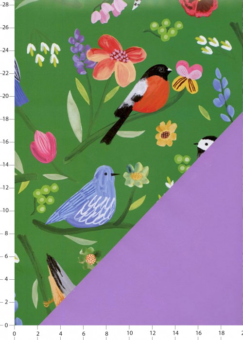 Papier imprimé recto verso, un coté représentant des oiseaux sur un fond vert et un uni violine.