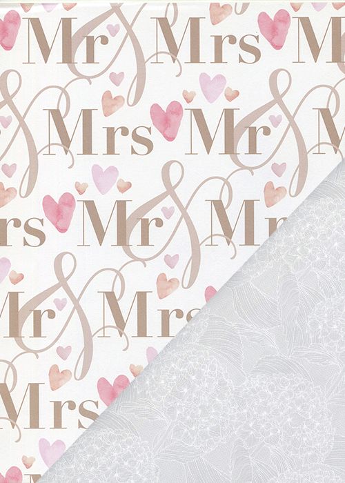 Papier imprimé recto verso avec sur une face les genres des heureux mariés (Mrs & Mr) avec des inscustations de coeurs pastels et sur l'autre face un imprimé type floral / géométrique blanc sur fond gris pâle.
