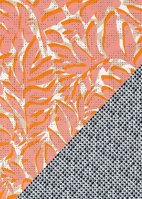 Papier imprimé recto verso. Sur une face une irmpression de feuilage aux couleurs vives dans les tons orangés avec une surimpression de pois noirs. Sur l'autre face, une impression géométrique et régulière de pois noirs et gris sur fond blanc.