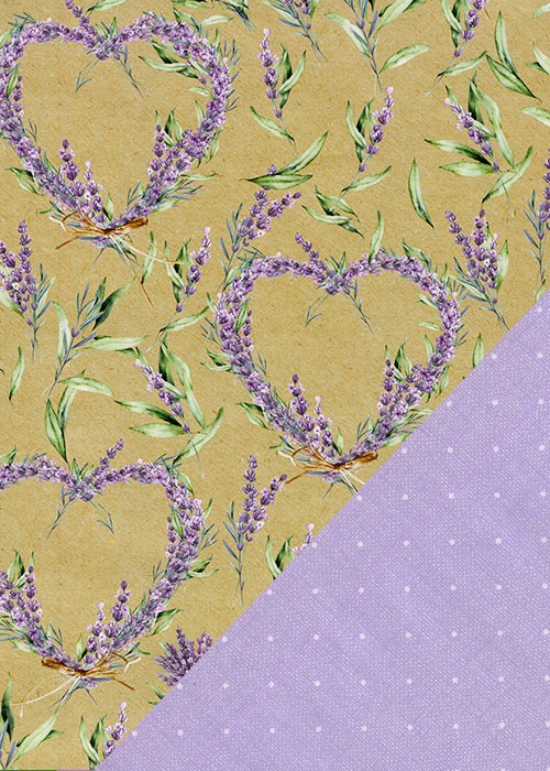 Papier imprimé recto verso cœurs et brins de lavande d'un côté pois blancs sur fond lavande de l'autre.